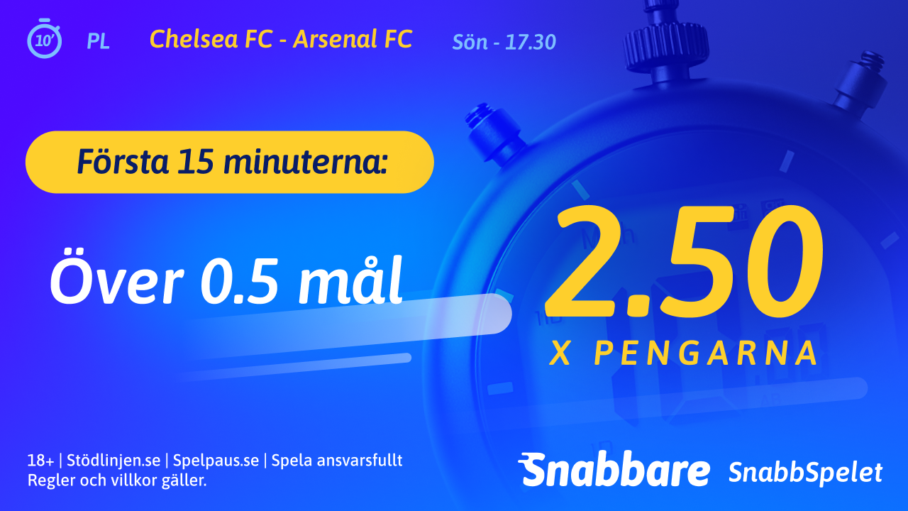 Inför Londonderbyt mellan Chelsea och Arsenal har Snabbare.com ett snabbspel som ger dig en vinst på 2.5 gånger pengarna. Allt som krävs är att det blir ett mål i matchen de första 15 minuterna.