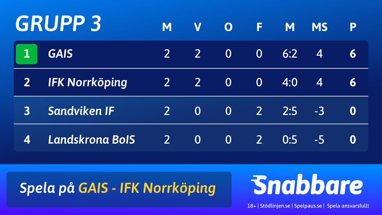 GAIS och IFK Norrköping har båda full pott efter två omgångar. Det blir därmed en direkt gruppfinal när lagen drabbar samman i Göteborg. Båda lagen har dessutom samma målskillnad, men eftersom GAIS har fler gjorda mål har man en fördel. Det innebär att ett kryss räcker för GAIS.