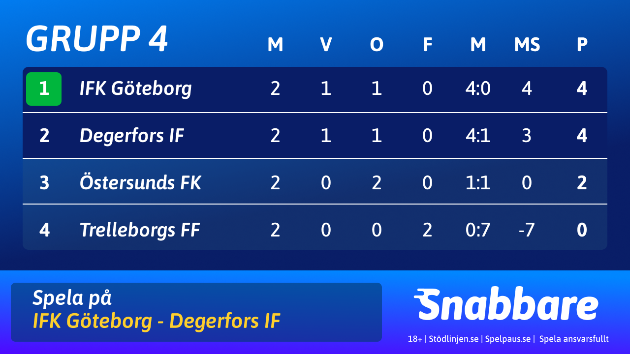 IFK Göteborg och Degerfors IF har båda fyra poäng och möts i sista omgången. IFK Göteborg, som har hemmaplan, har ett mål bättre i målskillnad. Det innebär att ett kryss räcker för att hålla Degerfors bakom sig. Men vid ett kryss i gruppfinalen finns det en liten chans att Östersunds FK passerar. De har just nu två poäng och vid en vinst mot Trelleborgs FF hamnar de också på fem poäng. Men då måste ÖFK vinna med minst fyra mål.