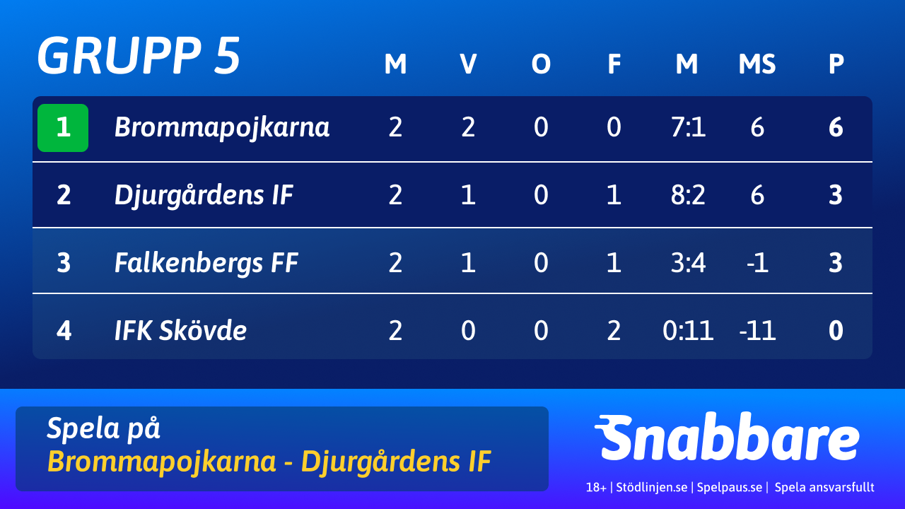 IF Brommapojkarna toppar gruppen med full pott. Djurgårdens IF är tre poäng bakom, men ställs mot BP i sista matchen. Lagen har samma målskillnad, vilket innebär att en seger räcker för att DIF ska passera BP och vinna gruppen. Matchen spelas på 3Arena.