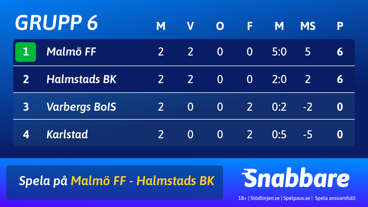 Malmö FF och Halmstads BK har full pott inför avgörandet och möts. MFF, som har hemmaplan, har bättre målskillnad. Det innebär att MFF enbart behöver ett kryss för att vinna gruppen.