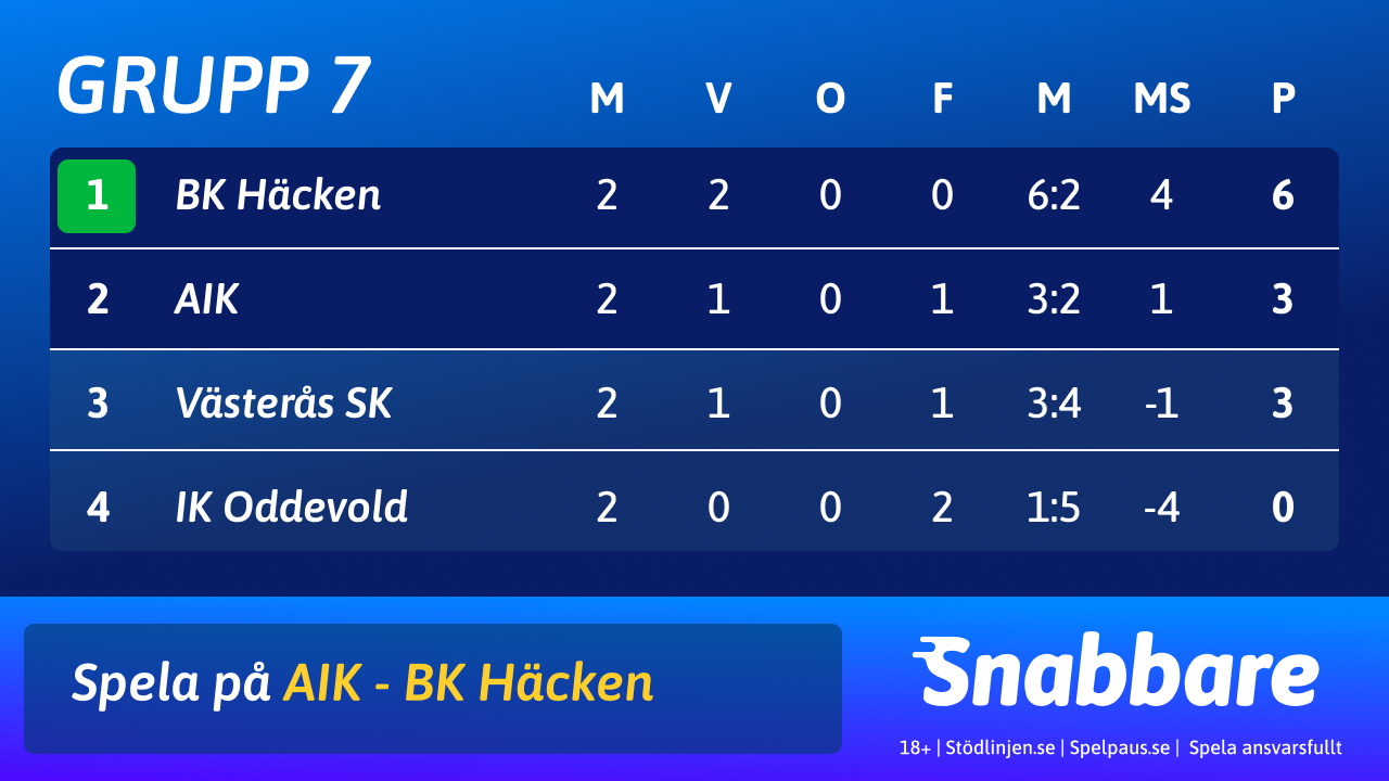 BK Häcken har sex poäng efter två matcher. AIK är tvåa med tre poäng. De möts i sista matchen på Nationalarenan. AIK behöver vinna matchen med två mål för att passera Häcken och vinna gruppen. Men i det scenariot kan även Västerås SK vinna gruppen, men behöver då besegra IK Oddevold stort. VSK har två mål upp till AIK i målskillnad.