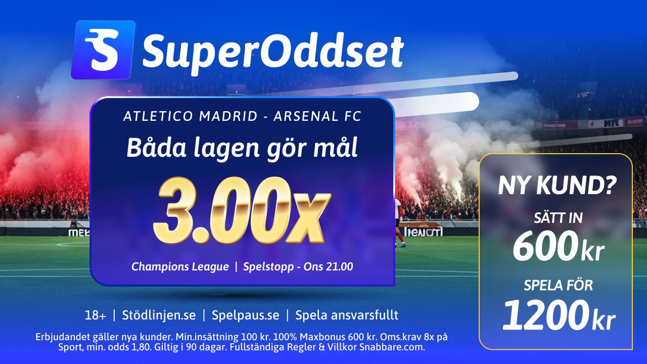 ANNONS. Atletico Madrid och Arsenal drabbar samman i Champions League. Om båda lagen gör mål vinner du hela tre gånger pengarna.