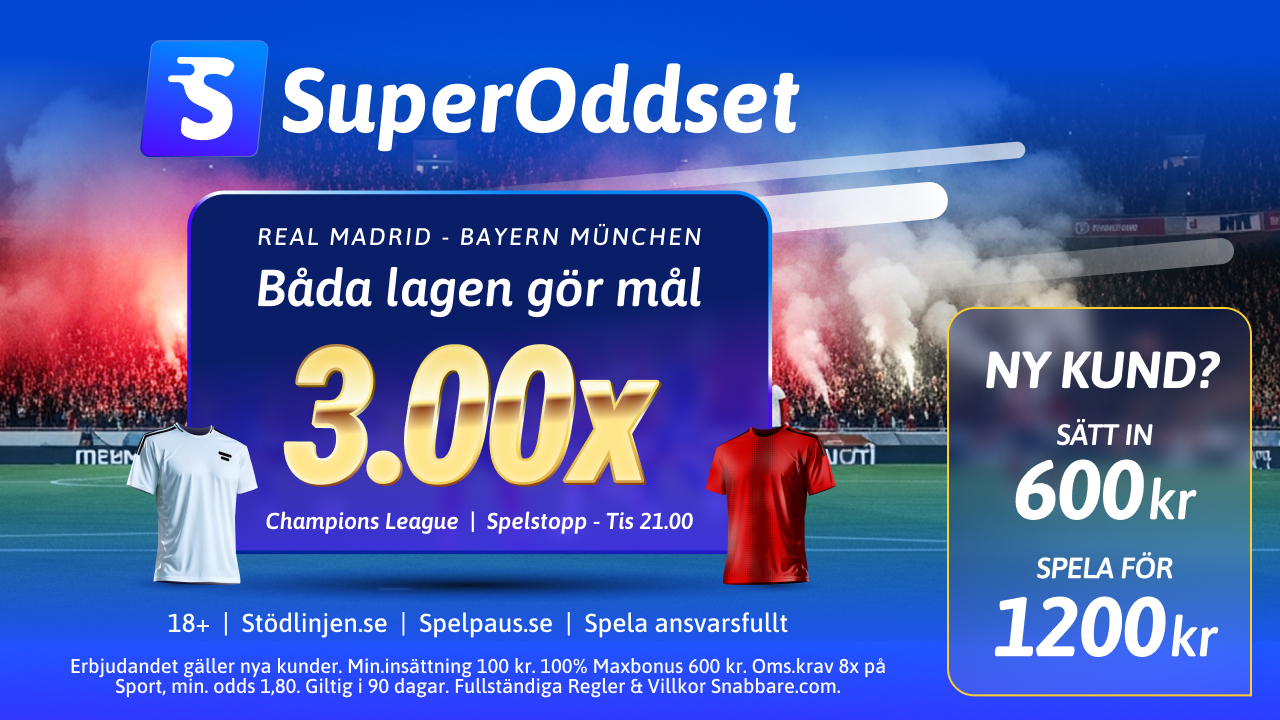 ”Superoddset” gäller endast en match i veckan, närmare bestämt veckans favoritmatch av Snabbare.com. Och den matchen, i detta falla Real mot Bayern, får ett boostad odds.